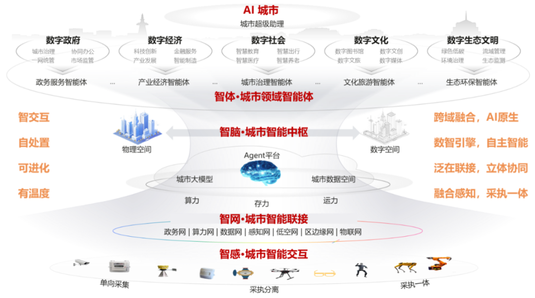 通过以上四个维度的跨越式发展,AI CITY构建起 “善感知、会思考、有温度、自进化” 的智能形态。它以“城市领域智能体”“城市智能中枢”“城市智能联接”“城市智能交互”的垂直贯通为核心架构,形成“自我感知-动态推演-精准执行”的完整运转闭环。这一架构不仅为城市全域数字化转型提供了坚实支撑,推动治理、服务、运行等各环节的系统性升级,更从技术创新与场景适配层面,为城市智能化演进持续注入鲜活动能。